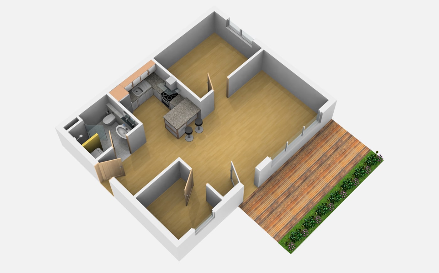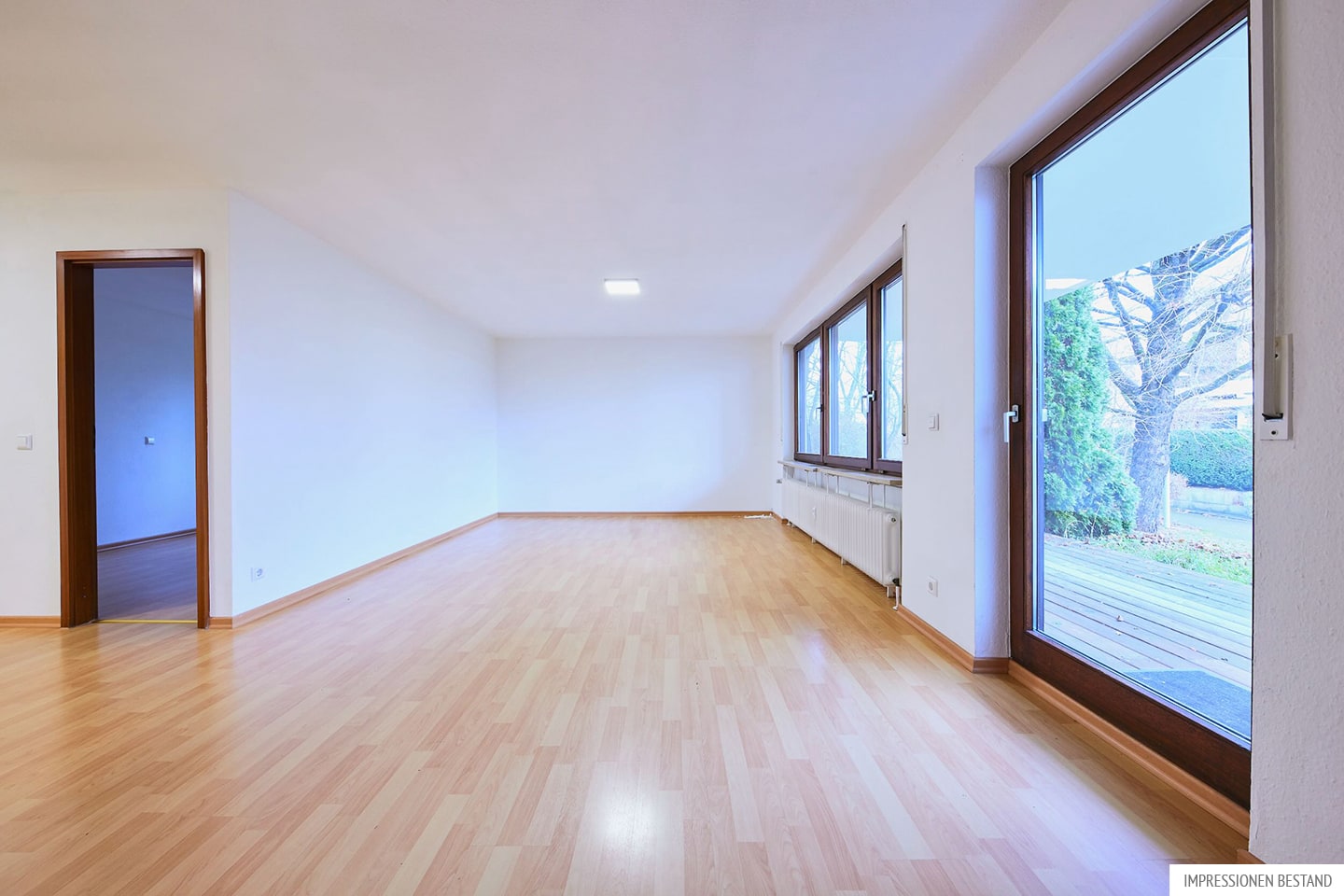 Die große Terrasse erweitert den Wohnbereich nach außen und bietet einen angenehmen Rückzugsort. Durch die geplante bzw. noch zu setzende Bepflanzung entsteht zusätzlicher Sichtschutz, sodass sich der Außenbereich künftig noch privater und ruhiger nutzen lässt.