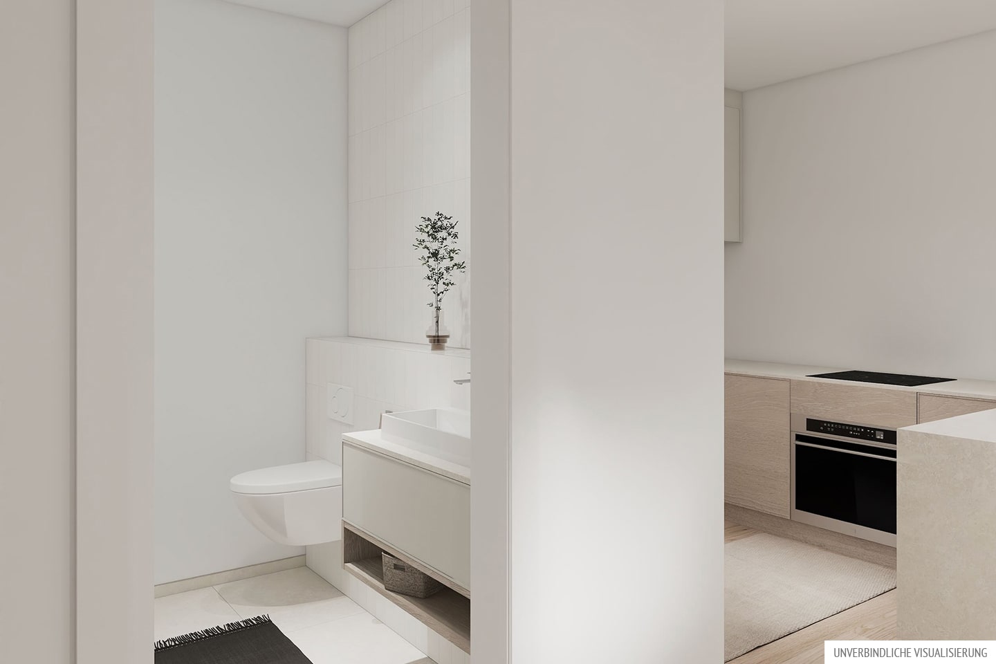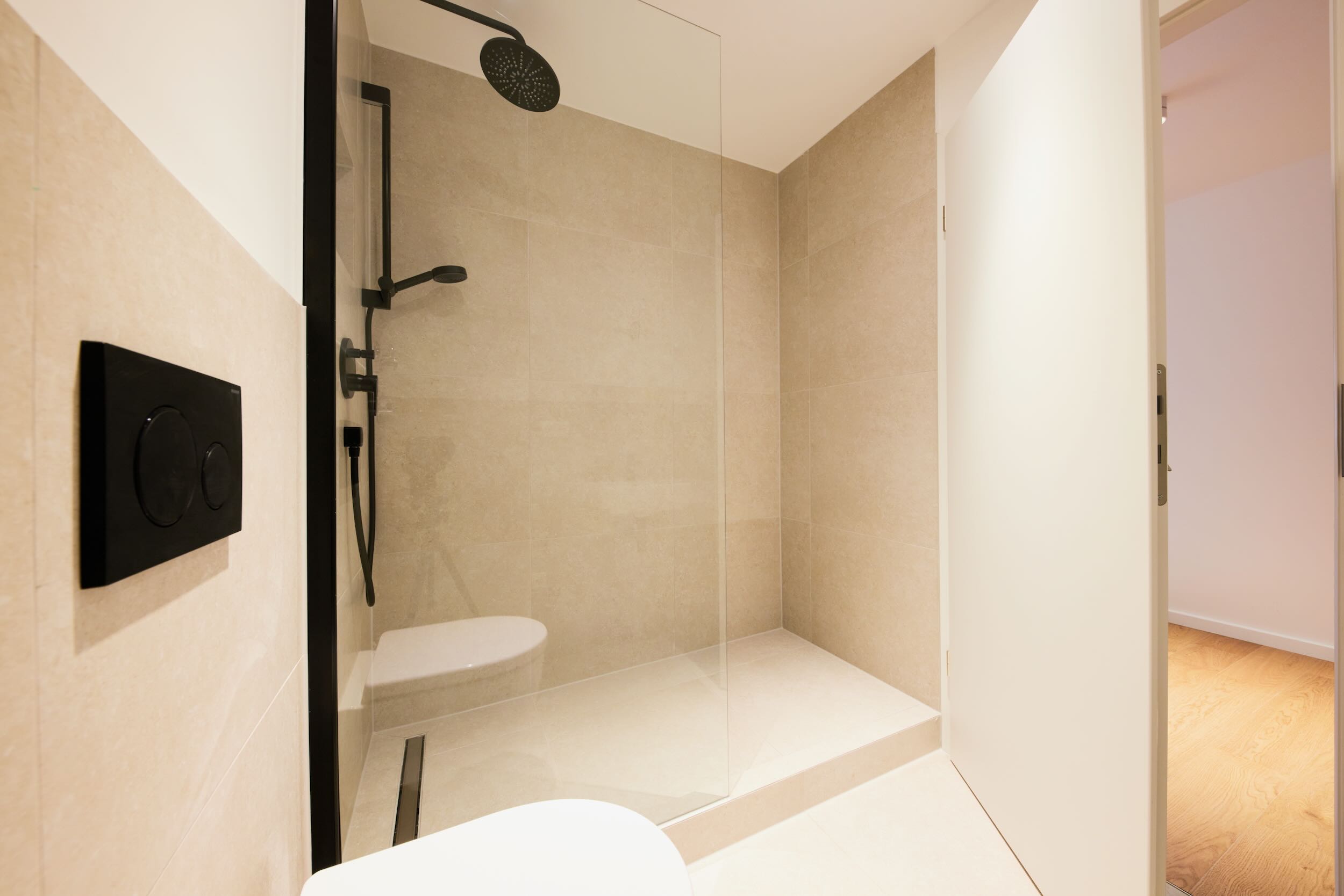 Auch der Sanitärbereich wurde anspruchsvoll erneuert. Großformatige Fliesen (60×60), eine komfortable Dusche, ein großzügiges Waschbecken sowie das separate WC runden das Raumkonzept ab – modern, gepflegt und alltagstauglich.