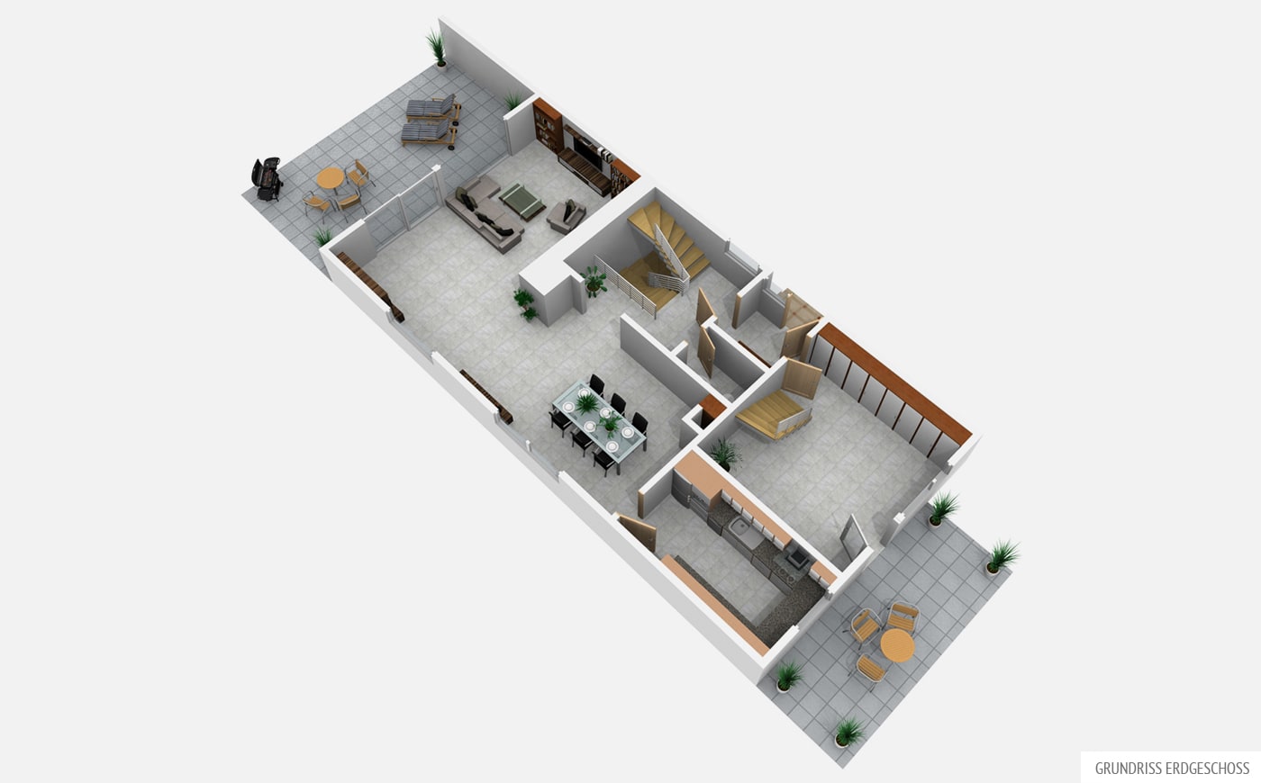 - Erdgeschoss: ca. 93,52 m², Wohnen, Essen, Vorraum, Küche, WC, Windfang, zwei Terrassen, Garten