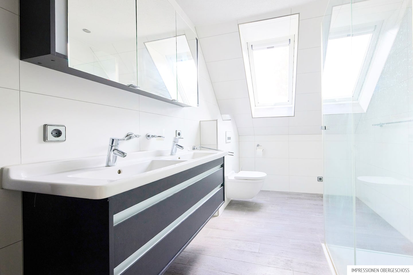 - Obergeschoss: ca. 79,33 m², drei Zimmer, zwei Sanitärbereiche, Vorraum und Balkon