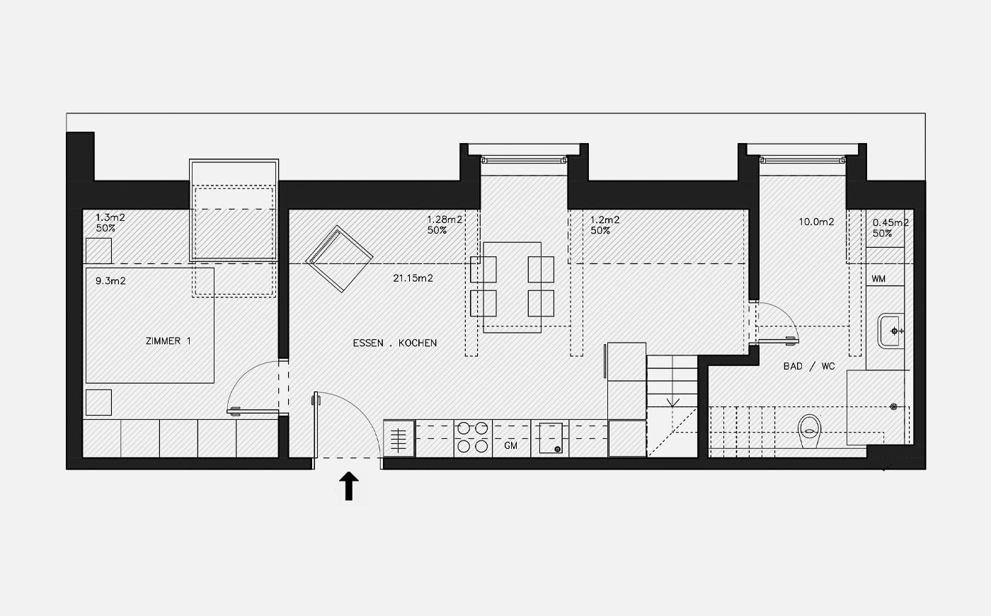 Die Wohnung erstreckt sich über zwei Ebenen im Dachgeschoss und überzeugt trotz der kompakten Fläche durch ein sehr smartes, offenes Wohnkonzept. Auf der ersten Ebene erwartet Sie ein heller, großzügig wirkender Wohn- und Essbereich mit offener Küche und Küchenblock – ideal für alle, die gerne kochen, Gäste empfangen und ein kommunikatives Raumgefühl schätzen. Ergänzt wird diese Ebene durch ein weiteres Zimmer, das sich flexibel als Schlafzimmer, Homeoffice oder Gästezimmer nutzen lässt, sowie einen modernen Sanitärbereich mit hochwertiger Ausstattung.