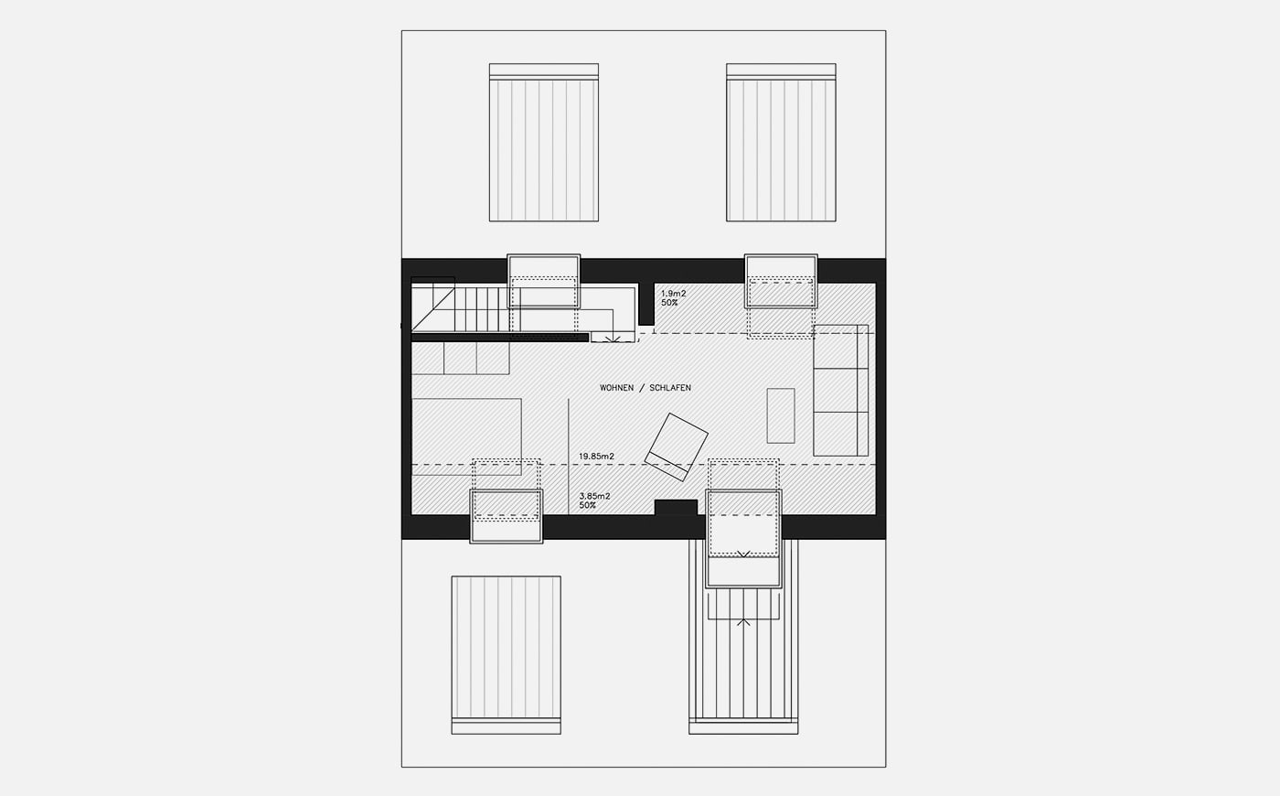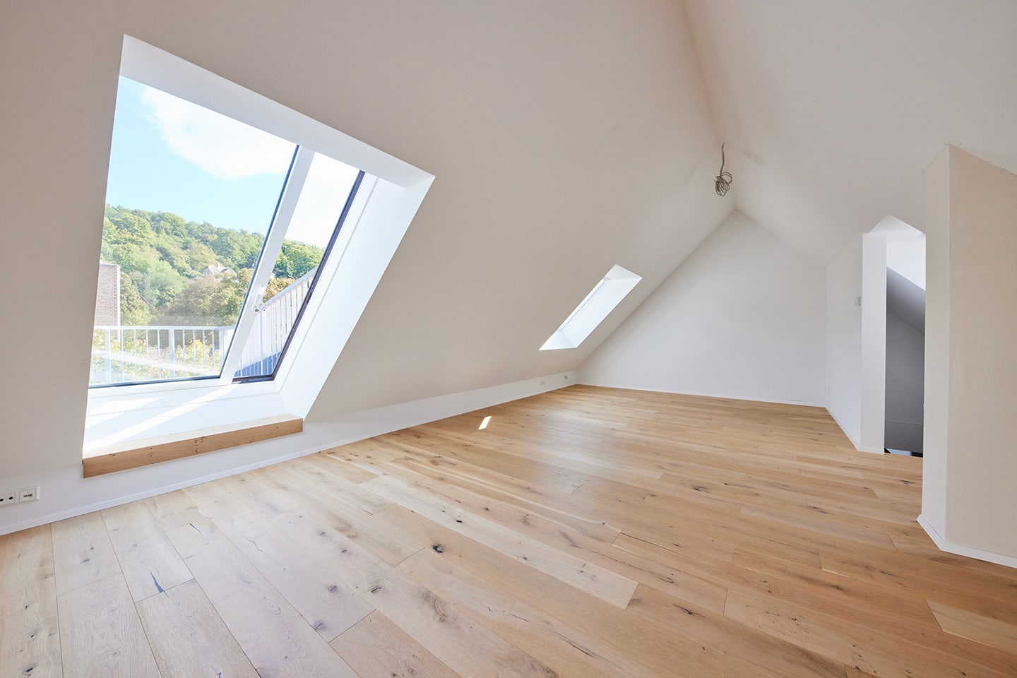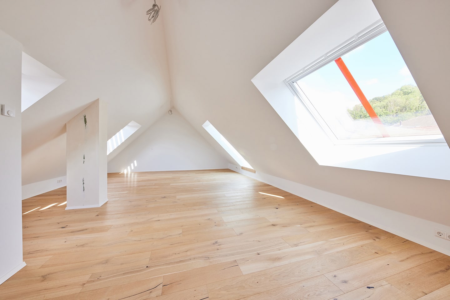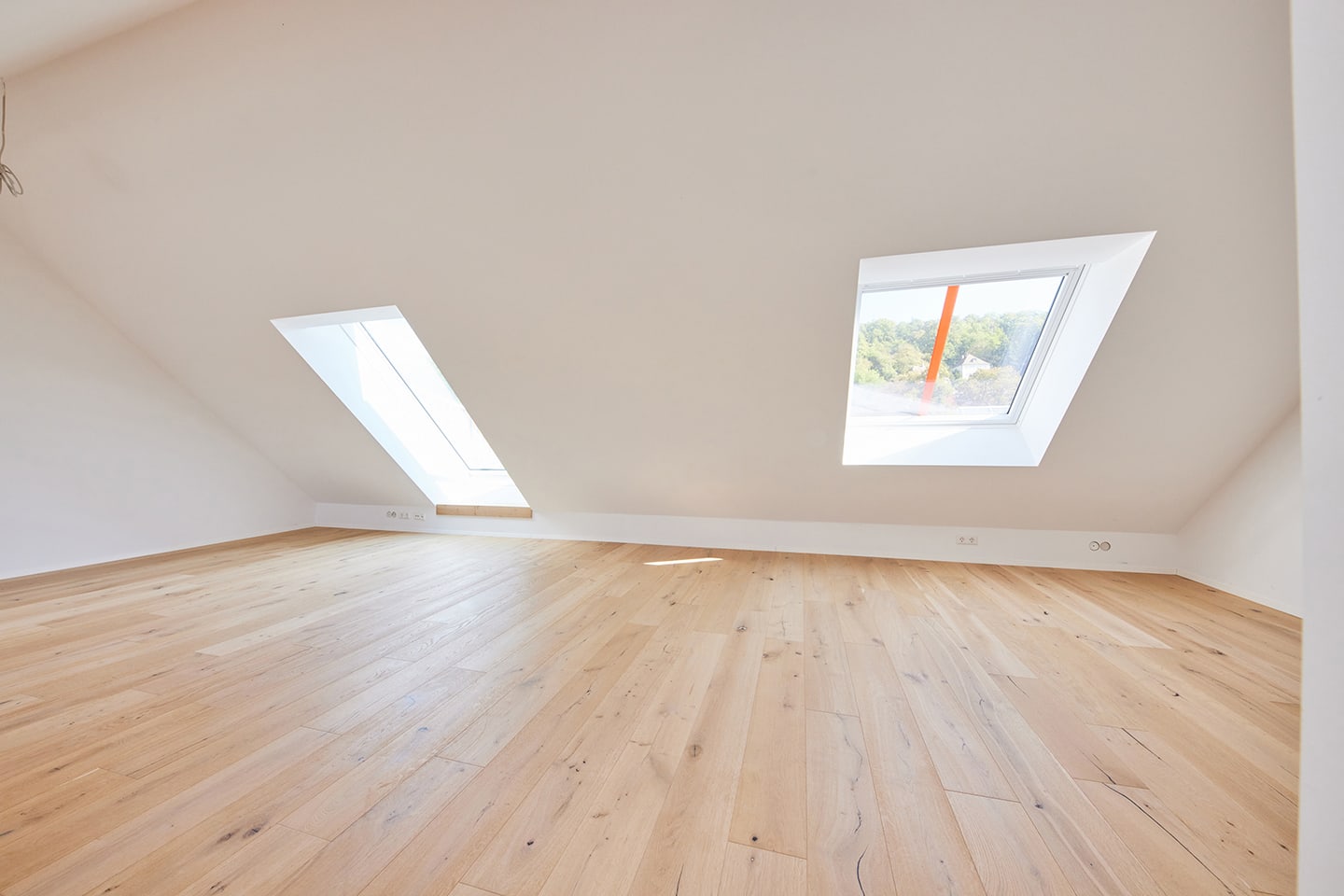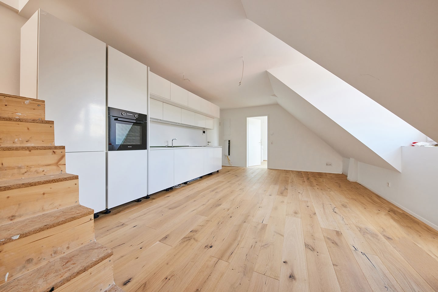 Über eine interne Treppe gelangen Sie auf die zweite Ebene der Maisonette. Hier öffnet sich eine große, zusammenhängende Fläche unter dem Dach, die je nach Bedarf als gemütlicher Schlafbereich, Studio, Arbeitszone oder Lounge genutzt werden kann. Die Dachgeschosslage verleiht der Wohnung eine besondere, fast loftartige Atmosphäre und unterstreicht ihren individuellen, „coolen“ Charakter.