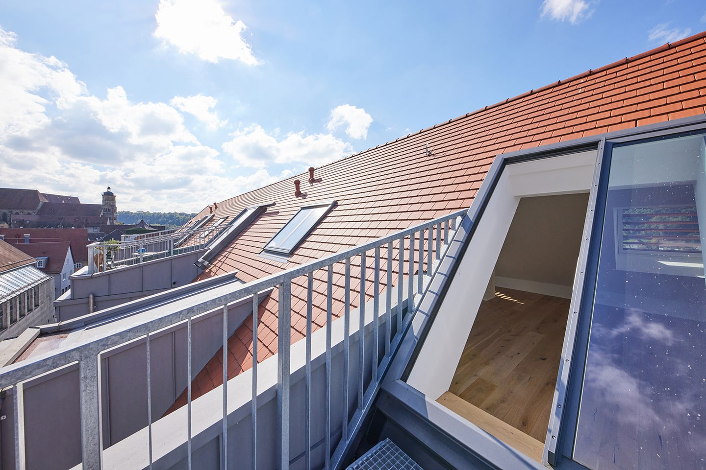 Die kompakte Maisonette besticht durch ihre moderne, offene Grundrissgestaltung und das großzügige Raumgefühl. Große Dachflächenfenster durchfluten die Räume mit natürlichem Licht und schaffen eine helle, freundliche Atmosphäre. Der helle Wohnbereich mit weitem Blick über die Dächer von Schwäbisch Hall bildet das Herzstück der Wohnung und lädt zum Entspannen und Verweilen ein.