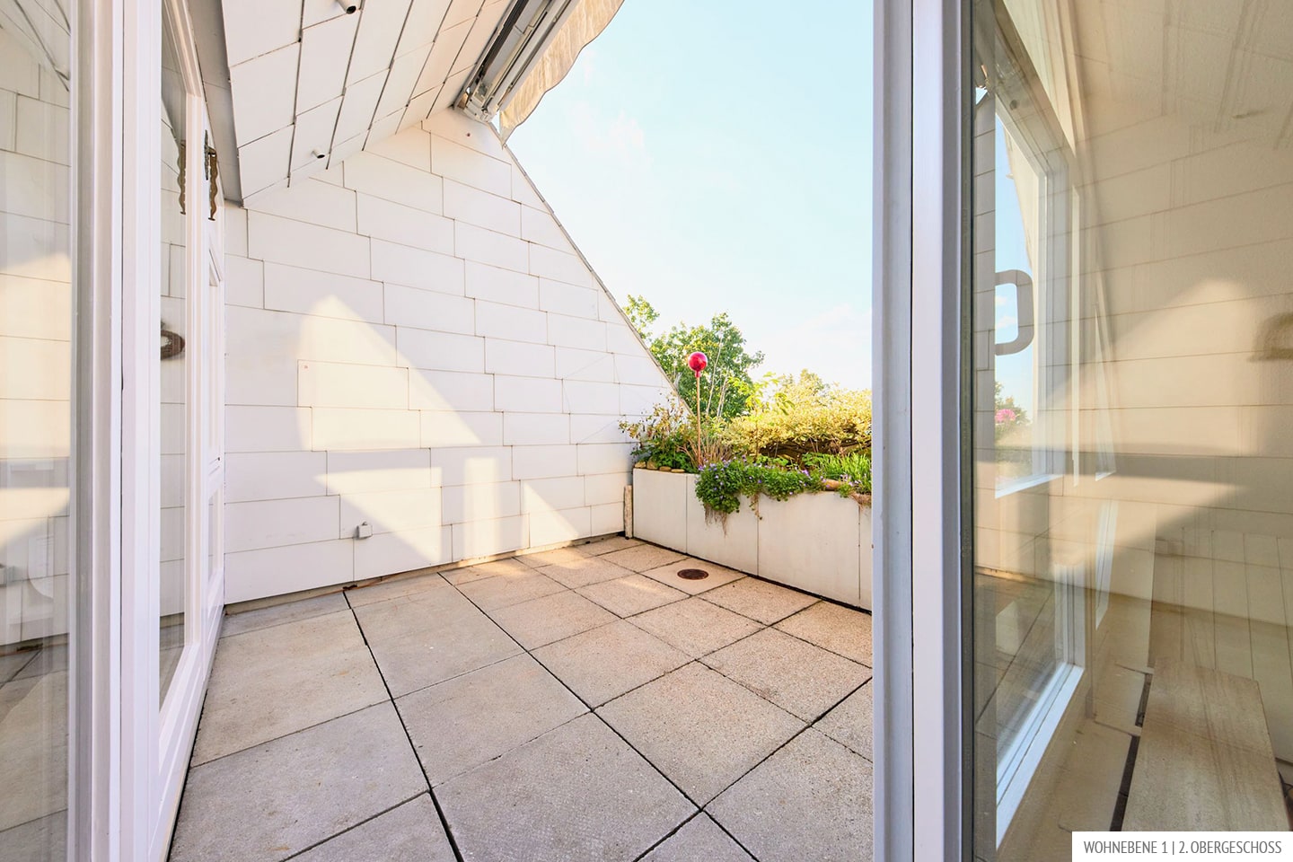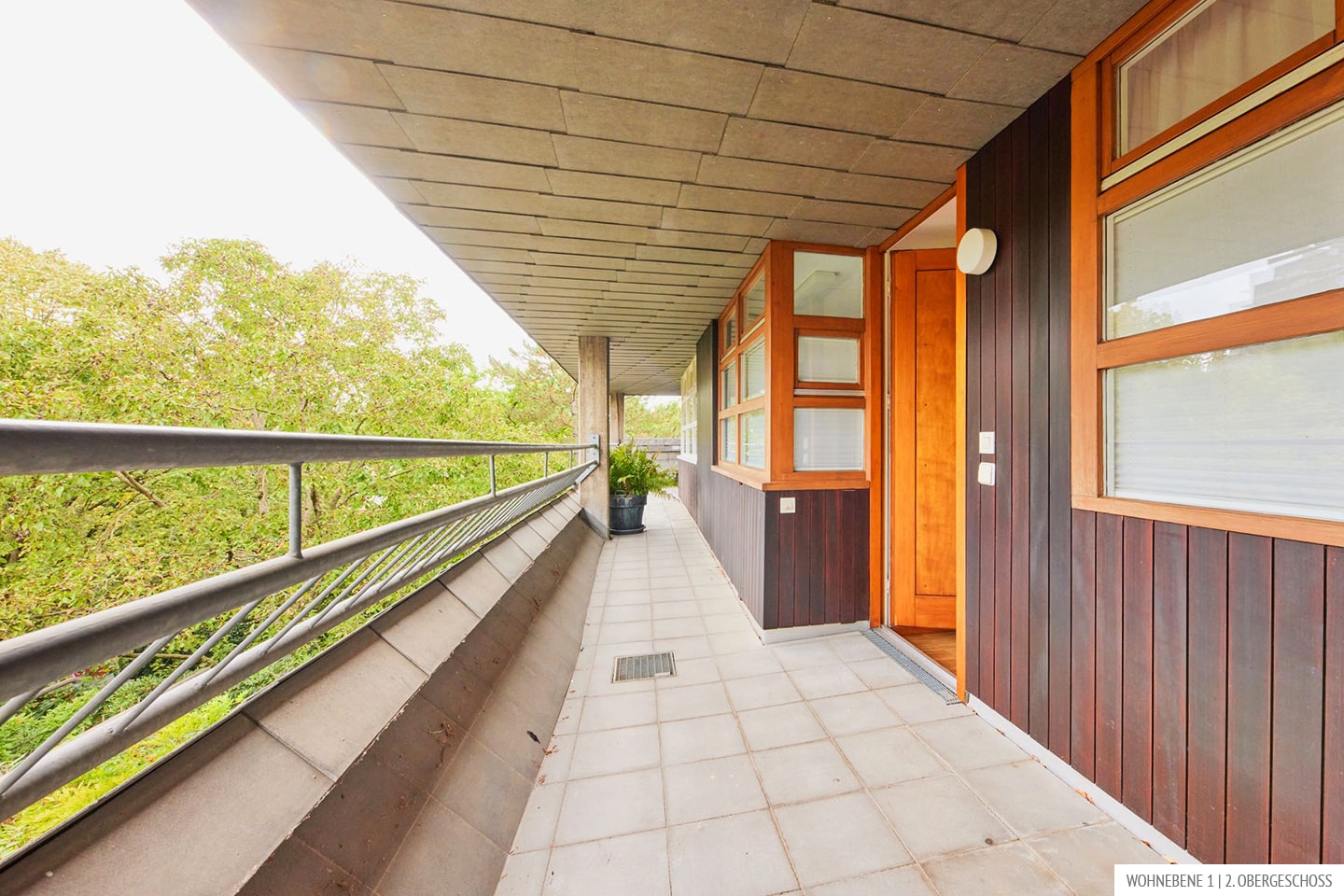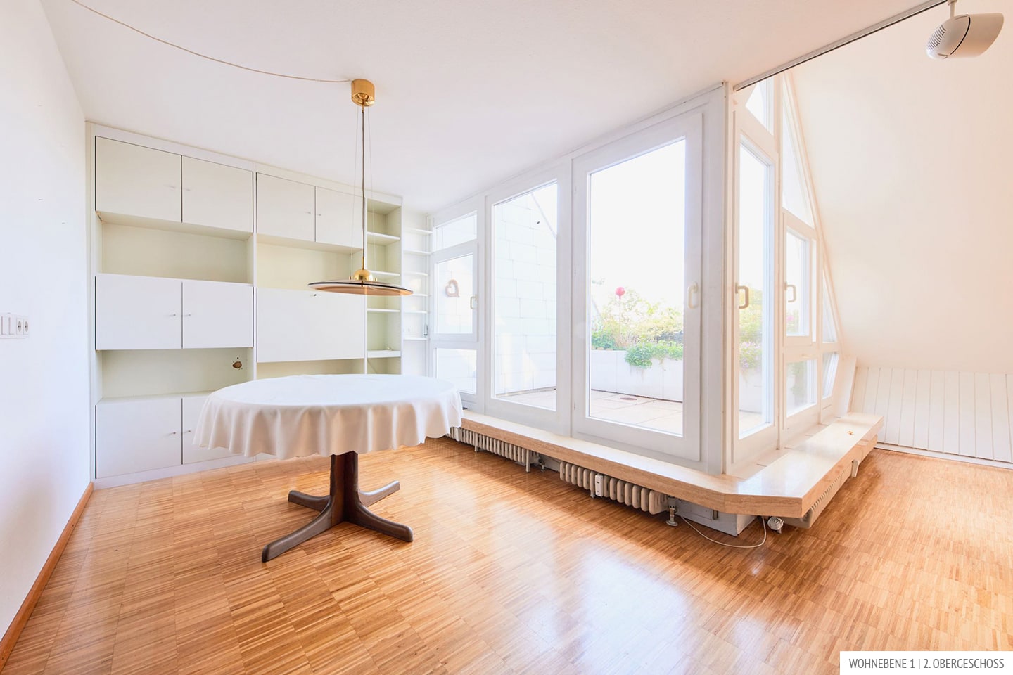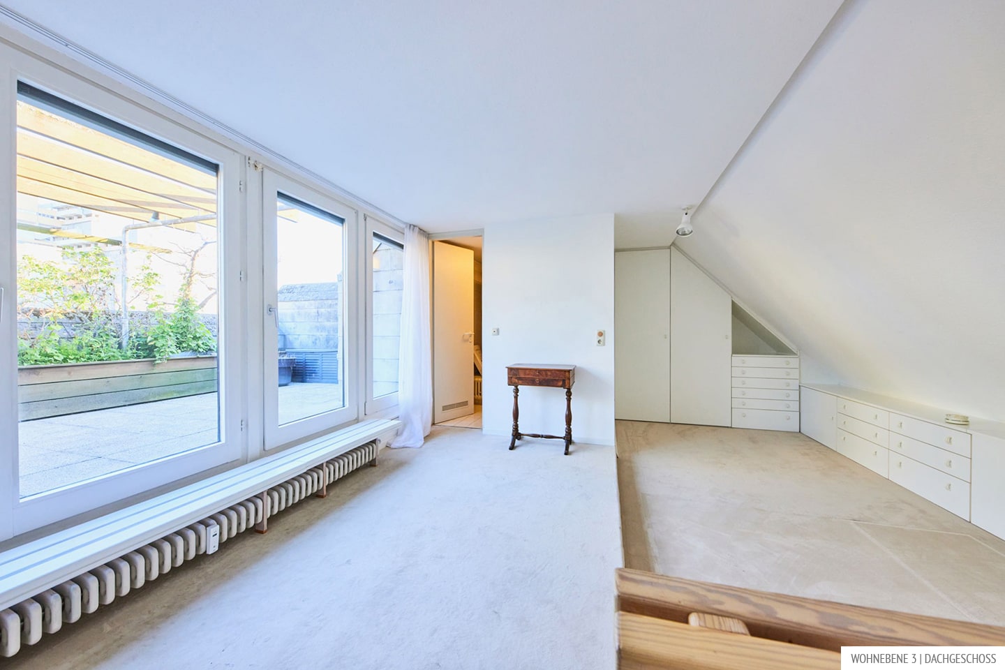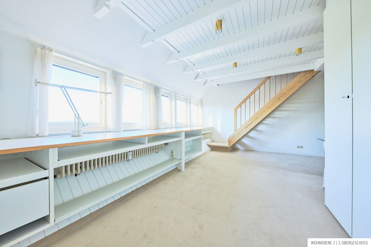 Über eine weitere Treppe gelangen Sie in das Dachgeschoss, wo eine lichtdurchflutete Galerie mit bodentiefer Fensterfront und der Zugang zur spektakulären Süd-West-Dachterrasse auf Sie warten. Durch die großzügige Verglasung entsteht ein besonders heller, offener Raumeindruck, der den wohnlichen Charakter dieser Ebene unterstreicht.