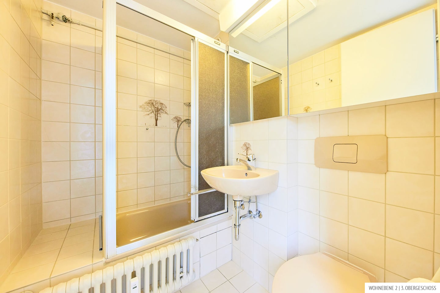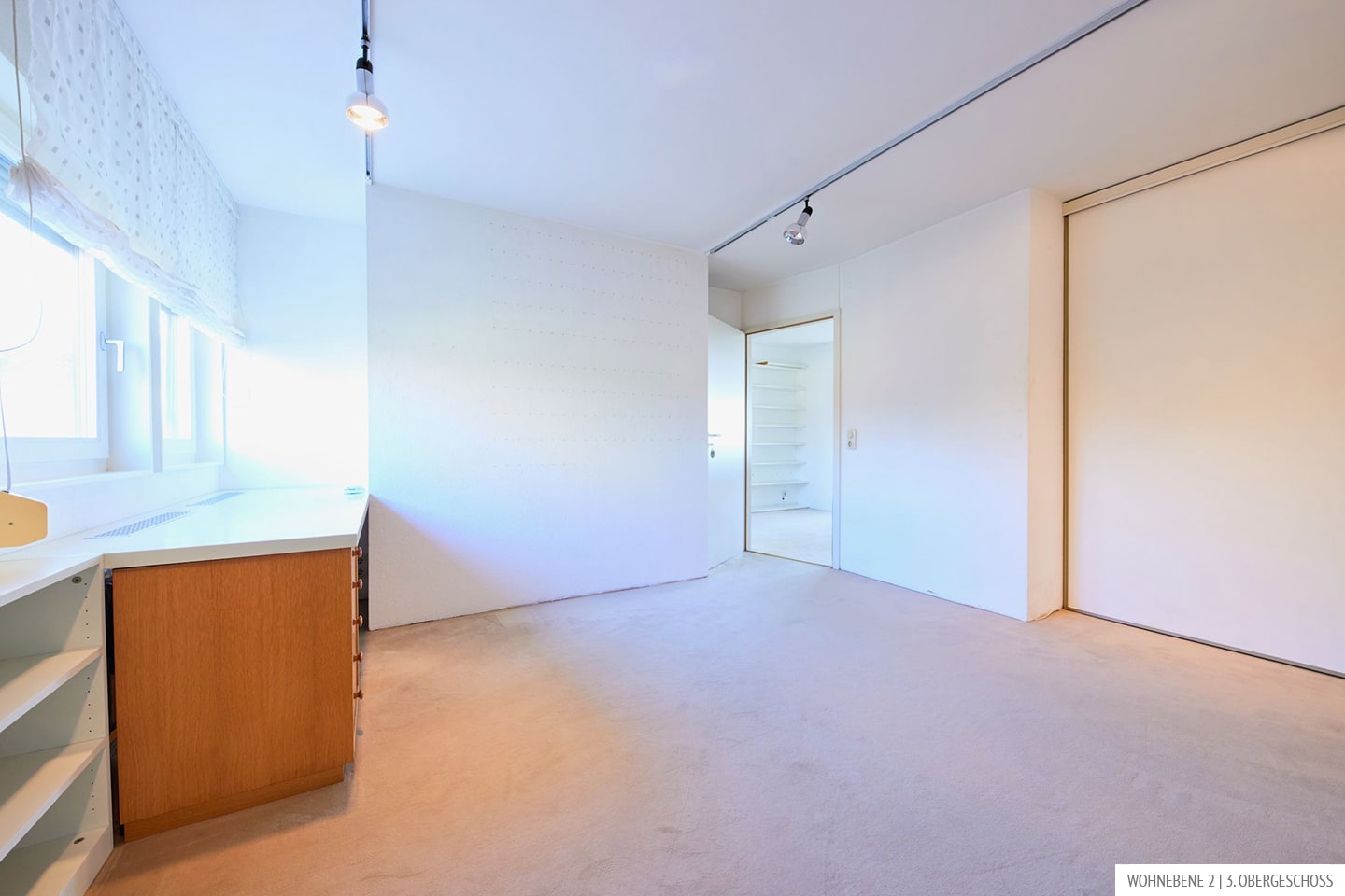 Die zweite Wohnebene im 3. Obergeschoss überzeugt mit einem offenen Dielenbereich, der flexibel als Arbeitszimmer oder zweiter Wohnbereich genutzt werden kann. Das großzügige Schlafzimmer mit hochwertigen Einbauten bietet Ruhe und Privatsphäre, kann bei Bedarf jedoch auch um ein weiteres Zimmer ergänzt werden – ideal etwa für ein Kinderzimmer oder Homeoffice. Alternativ lassen sich auf dieser Ebene auch zwei Kinderzimmer realisieren, was die Wohnung zu einem perfekten Zuhause für Familien macht.