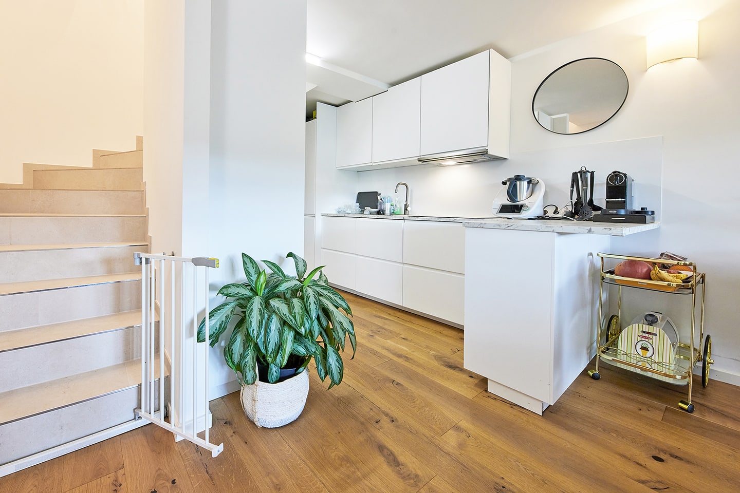 Die hochwertig und stilvoll ausgeführte Einbauküche in Weiß integriert sich harmonisch in das ruhige Designkonzept. Backofen und Mikrowelle sind ergonomisch auf Arbeitsplattenhöhe platziert; Miele Einbaugeräte unterstreichen den gehobenen Qualitätsanspruch. Die Wohn und Schlafräume sind mit Landhausdielen in Eichenparkett (abgefaste Kanten) ausgestattet und vermitteln eine warme, elegante Atmosphäre. Das Gesamtbild: zeitlos, klar und wertig – ideal für eine moderne Lebensführung.