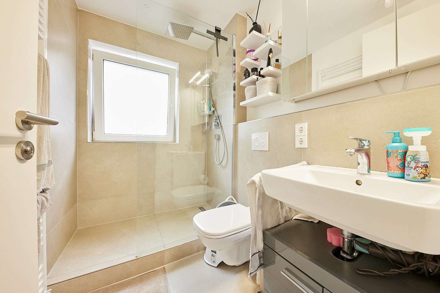 - Tageslichtbad mit begehbarer Dusche, Waschbecken und WC