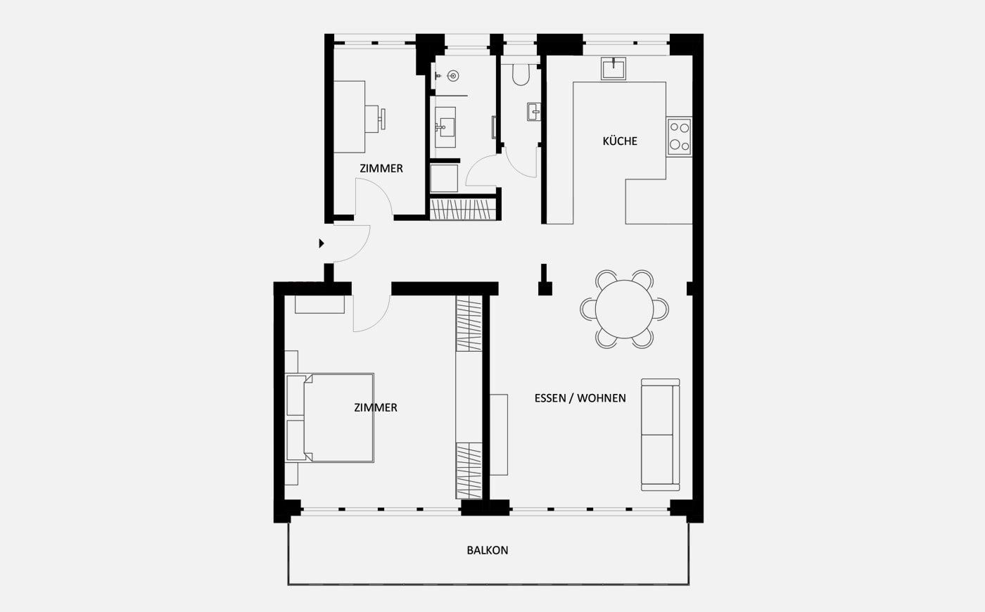 Die Lage im Hochparterre gewährleistet eine komfortable Erreichbarkeit und einen harmonischen Raumeindruck. Das Herzstück der Wohnung bildet ein offen gestalteter Wohn-, Ess- und Küchenbereich, der durch seine fließende Raumstruktur ein modernes, einladendes Wohnambiente schafft und zum geselligen Mittelpunkt des Alltags wird. Besonders hervorzuheben ist der außergewöhnlich große Balkon, der den Wohnbereich spürbar erweitert und vielfältige Nutzungsmöglichkeiten im Freien bietet. Die hervorragende Belichtung verleiht allen Räumen eine offene, freundliche Atmosphäre und unterstreicht die hohe Wohnqualität dieser Einheit.