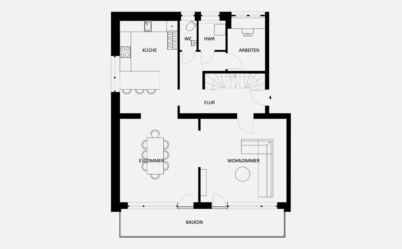 Die durchdachte Raumaufteilung macht diese Maisonette-Wohnung besonders attraktiv: Im Obergeschoss (Ebene 1) befinden sich der großzügige Wohn- und Essbereich mit direktem Zugang zum Balkon, eine moderne Küche mit Kochinsel, ein praktisches Arbeitszimmer sowie ein separates Gäste-WC. Das Dachgeschoss (Ebene 2) bietet mit drei Schlafzimmern – zwei davon mit Zugang zu dem gut nutzbaren Balkon – und dem Tageslichtbad einen privaten Rückzugsbereich für die ganze Familie. Diese Aufteilung schafft eine perfekte Trennung zwischen Gemeinschafts- und Privatbereichen. Rückzugsbereich für die ganze Familie. Diese Aufteilung schafft eine perfekte Trennung zwischen Gemeinschafts- und Privatbereichen.