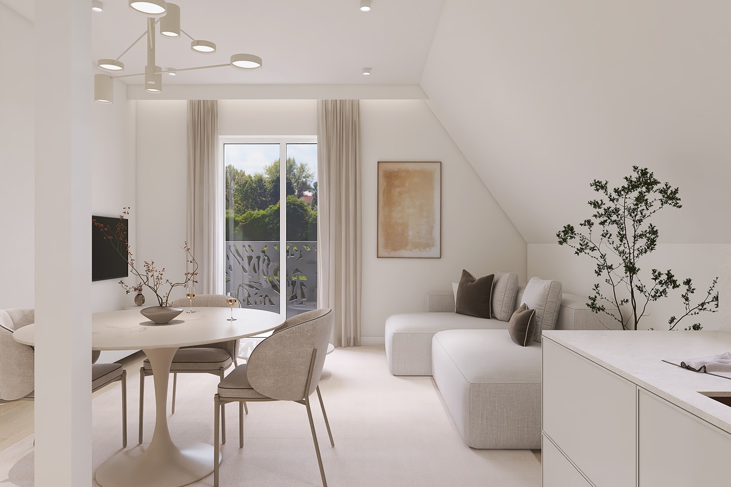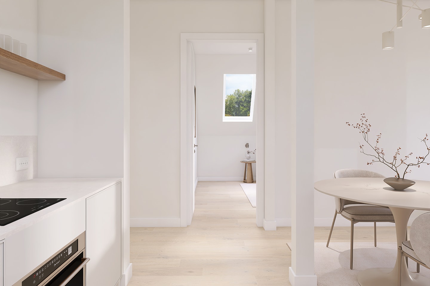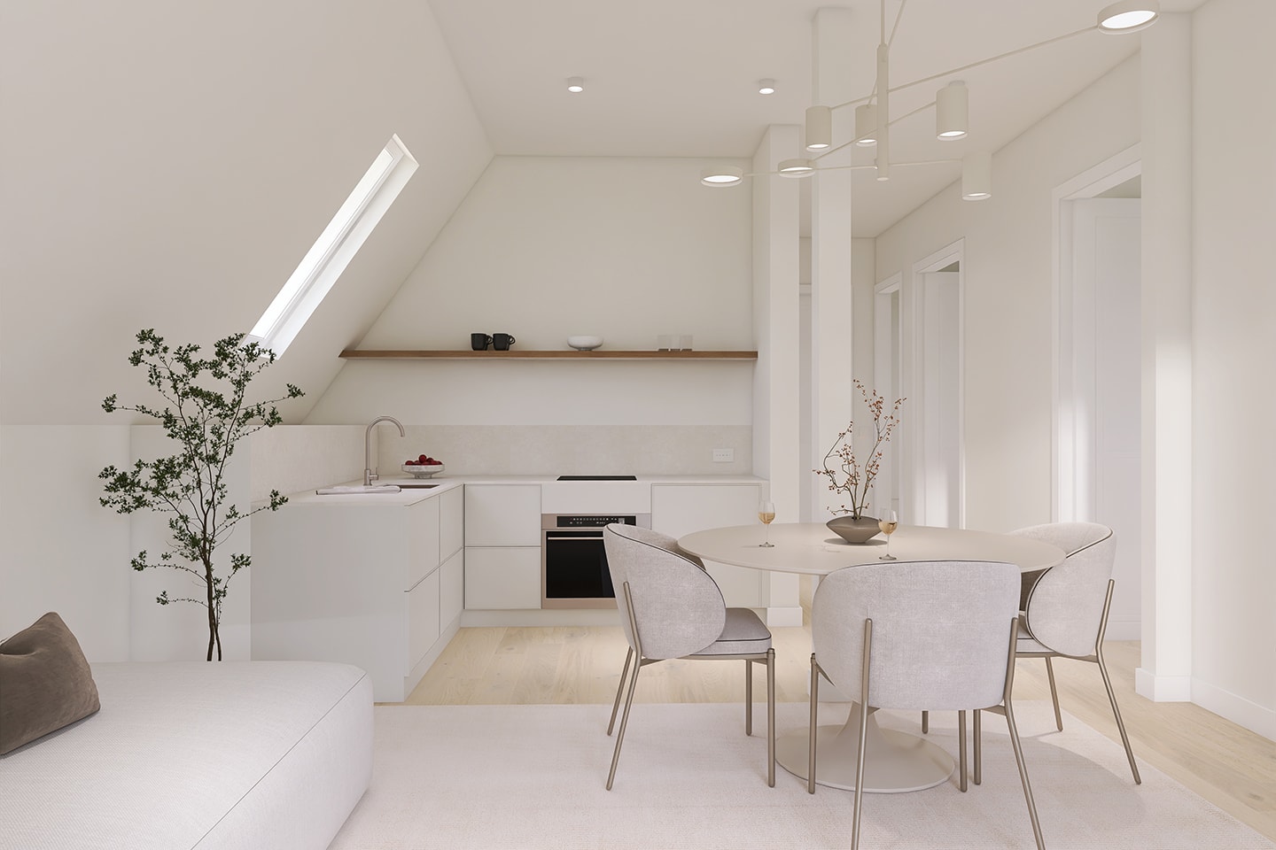 Parkettböden in allen Wohnräumen, weiß lackierte Türen und Kunststofffenster mit 3-fach-Verglasung schaffen eine stilvolle und wohnliche Atmosphäre. Das Herzstück der Wohnung bildet ein offen gestalteter Wohn- und Küchenbereich, der durch seine moderne, fließende Raumstruktur ein einladendes Wohnambiente schafft – mit direktem Zugang zum gut nutzbaren Balkon. Das moderne Tageslichtbad mit einer Hansgrohe Wellness-Dusche, hochwertigen Marken-Armaturen und Handtuchheizkörper bietet höchsten Komfort.