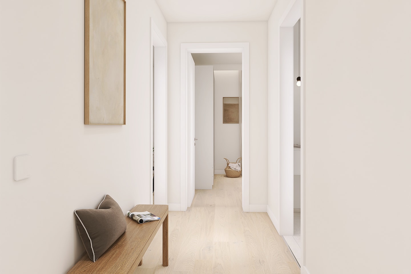 - Parkett in Wohn- und Schlafbereichen, großformatige Feinsteinfliese