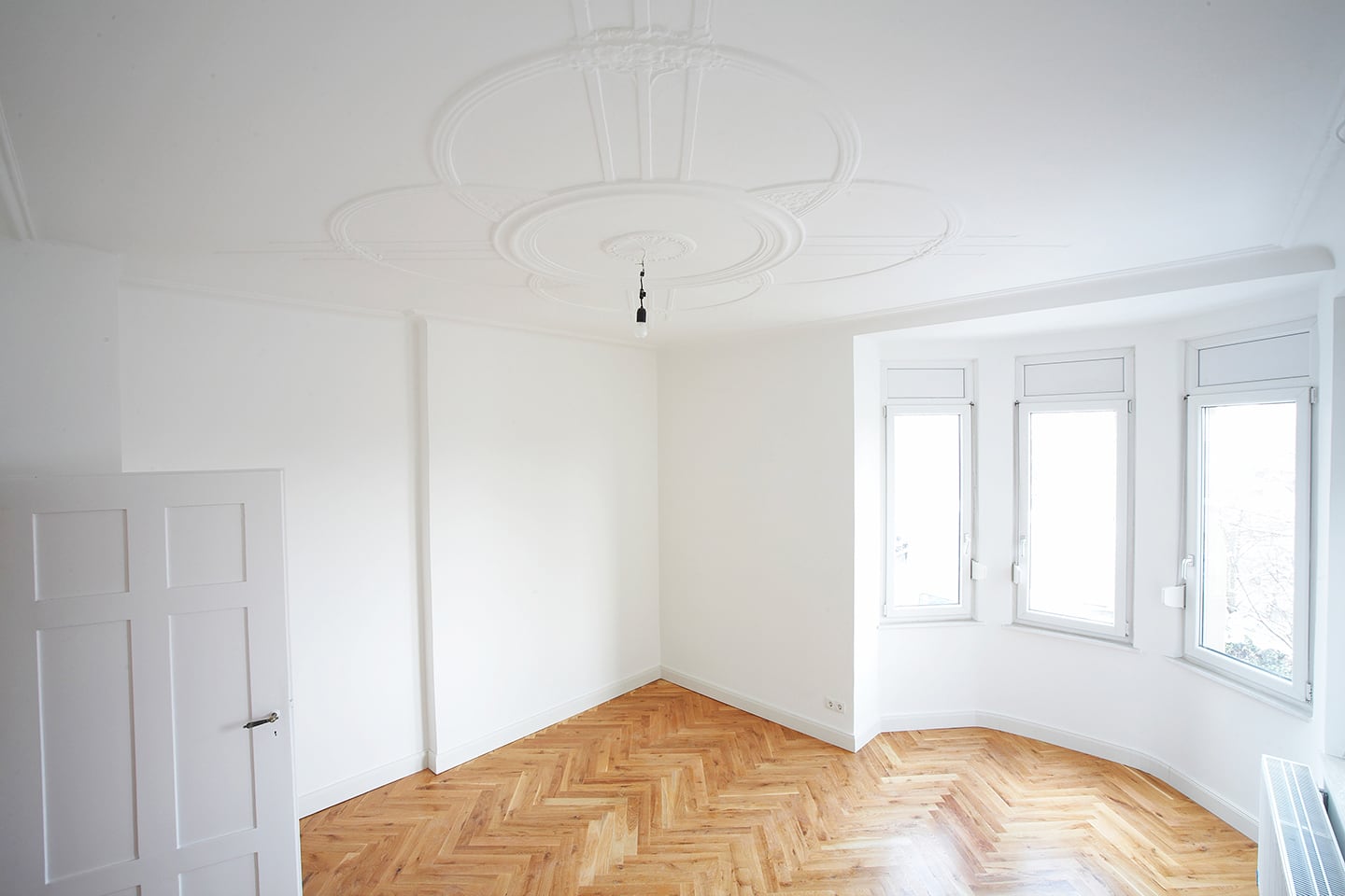 Revitalisierung, Sanierung und Innenausbau einer renovierungsbedürftigen 4-Zimmer Altbauwohnung zu einer echten klassischen Altbauetage mit Fischgrätenparkett, Wintergarten, hochwertigen Badausstattung, indirekter Beleuchtung und baujahrstypischen Stuckelementen in Stuttgart.
