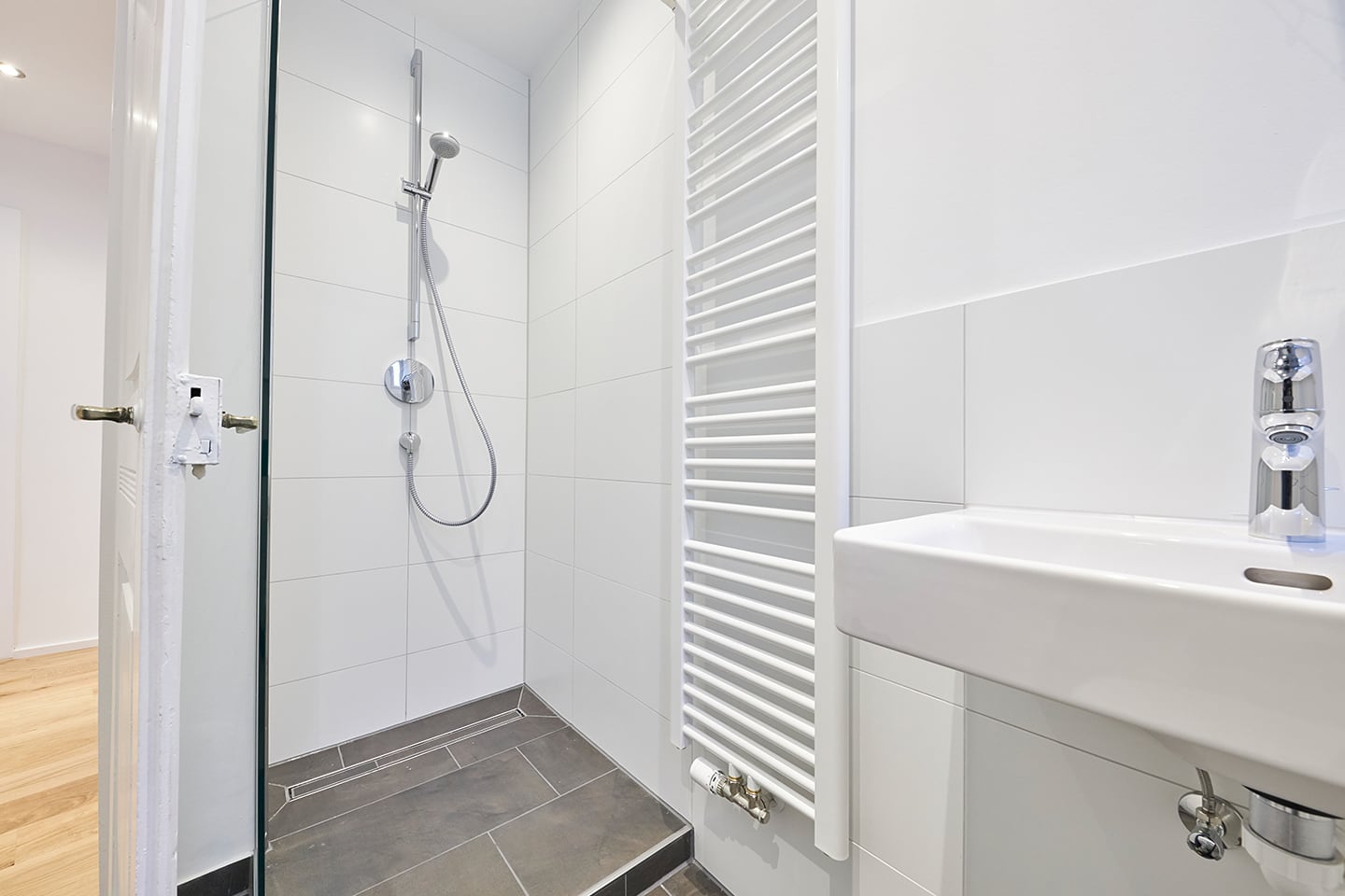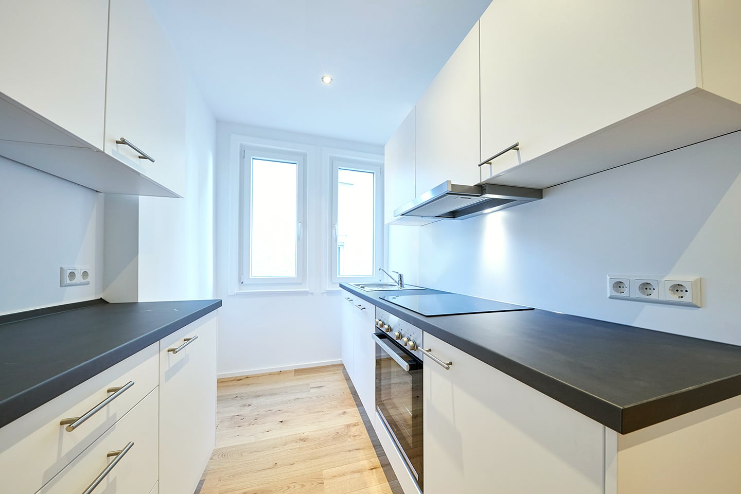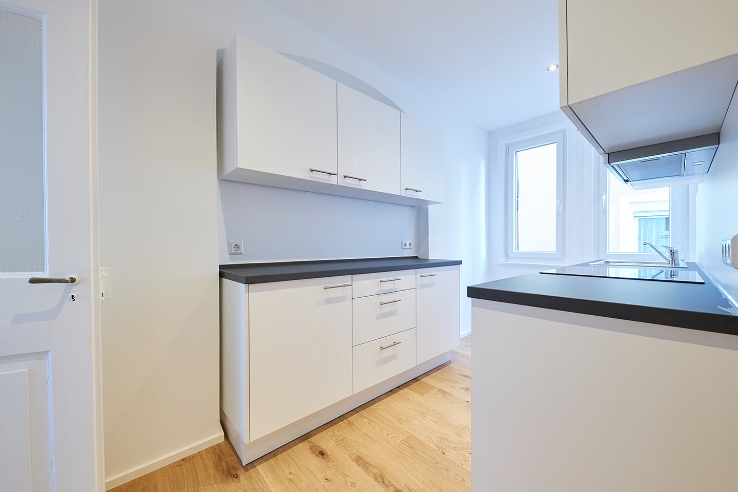 Sanierung und Innenausbau einer komplett unrenovierten 3-Zimmer Altbauwohnung in Untertürkheim. Die Wohnung wurde umfangreich kernsaniert und mit viel Liebe zum Detail ausgestattet. Im ehemaligen WC wurde ein Sanitärbereich mit Dusche, Waschbecken und WC realisiert. Die kleine Küche wurde mit hochwertigen Marken-Einbaugeräten ausgestattet.